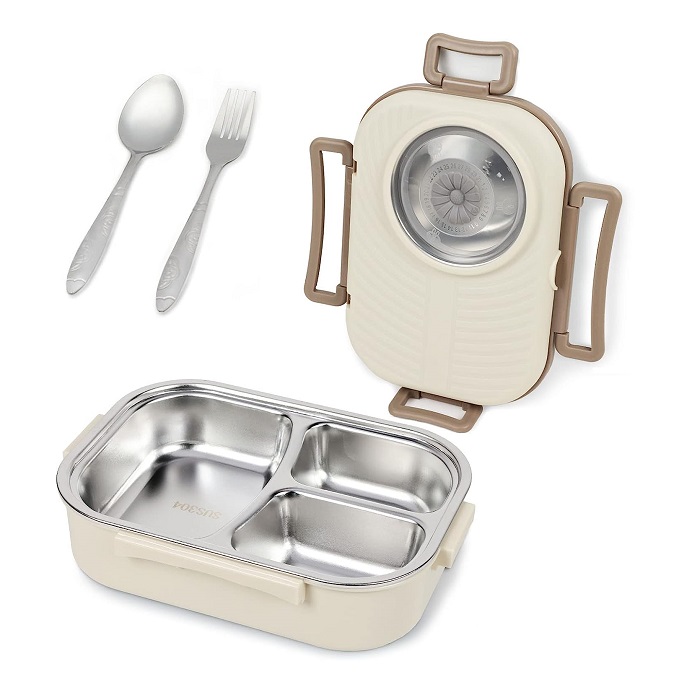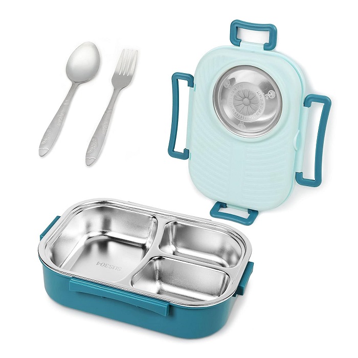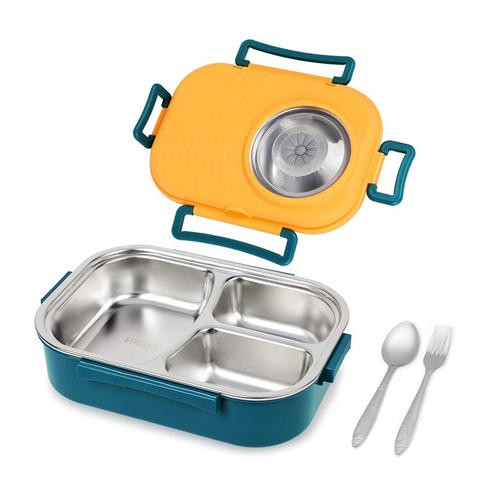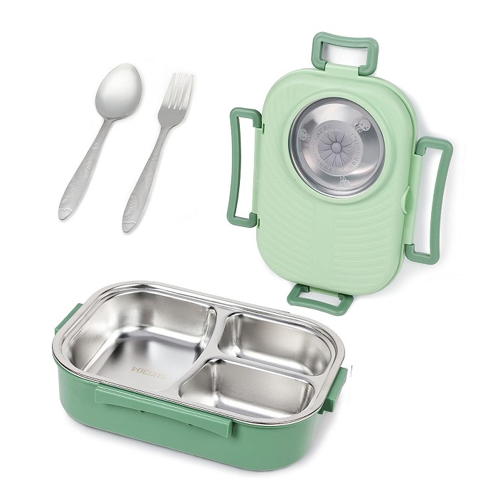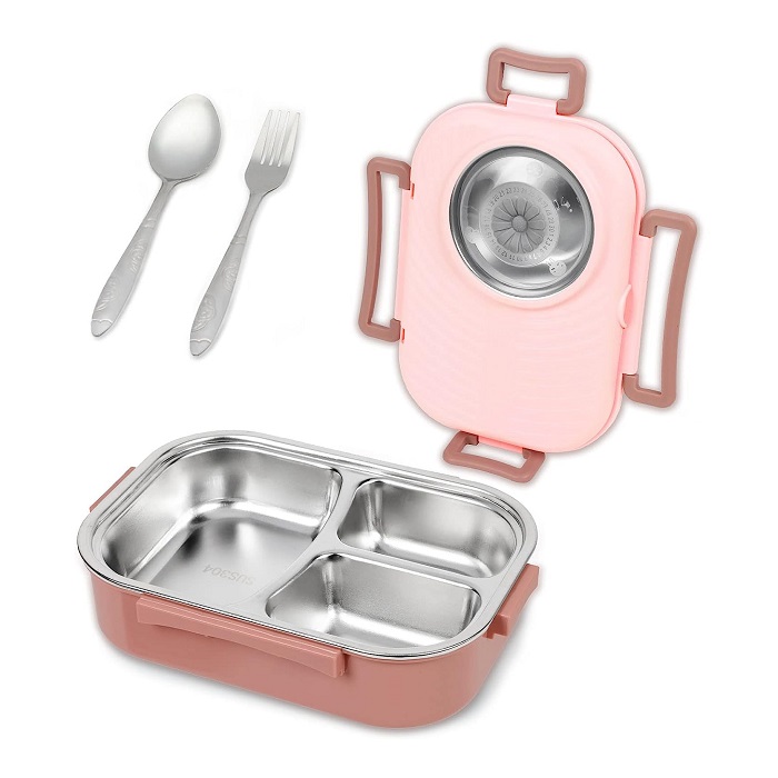 Hộp cơm cho bé mang đi học Kenze được thiết kế ngăn trên đựng nước canh, khăn giấy. Ngăn dưới đựng thức ăn