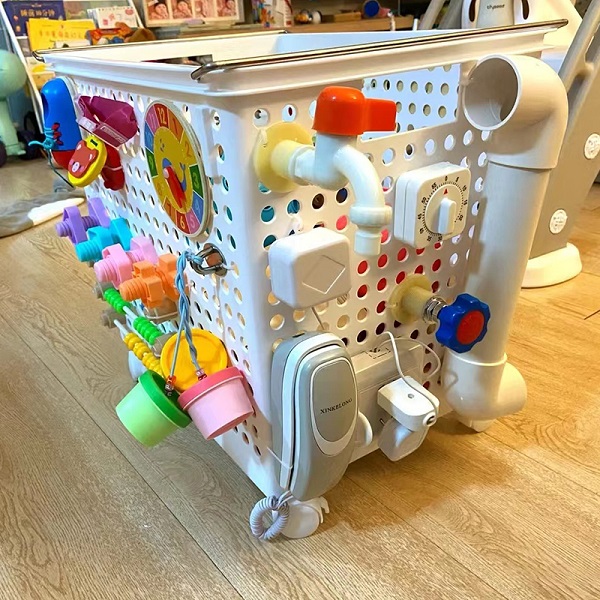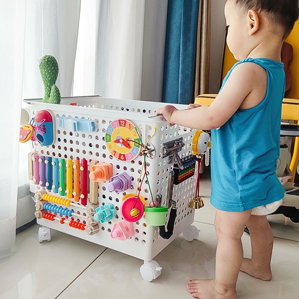 Thùng để đồ chơi cho bé có bánh xe kết hợp đồ chơi busy board