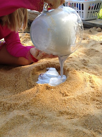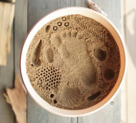 Bạn trải cát trên 1 mặt phẳng và cho bé đặt chân mạnh xuống mặt cát hoặc bất kỳ đồ vật gì bạn muốn ấn xuống mặt cát. Sau đó nhấc chúng lên và trên mặt cát sẽ còn vết tích của đồ vật. Và bây giờ bạn chỉ cần pha ít thạch cao với nước và đổ vào lỗ đó, đợi chờ 2h – 3h để chúng khô lại. Bây giờ bạn đã sở hữu 1 bộ hóa thạch độc đáo.