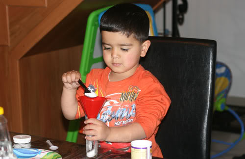- Hãy chỉ cho bé nhìn các nguyên liệu tan dần trong nước và thế nào gọi là hòa tan chứ không phải biến mất.