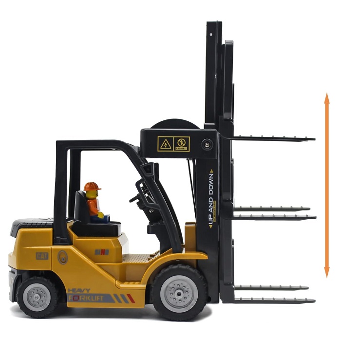 Xe nâng đồ chơi điều khiển từ xa với các chức năng gồm: tiến, lùi, rẽ trái, rẽ phải, nâng hạ lên xuống hàng hoá